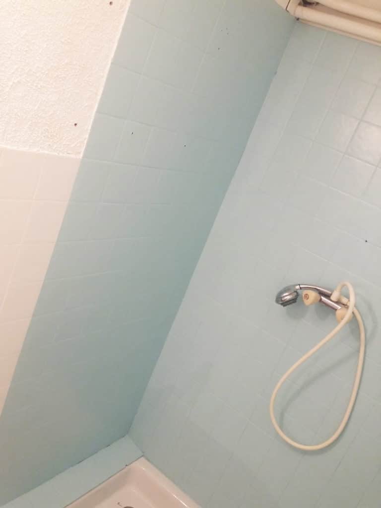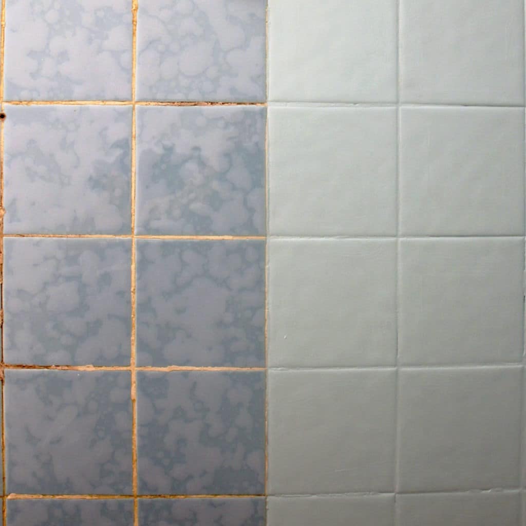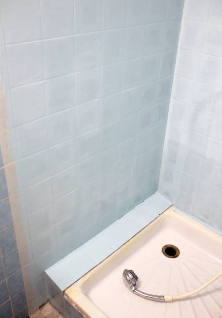La différence saute aux yeux : voici des carreaux rénovés, rafraîchis, et même personnalisés. Ici, le choix de deux couleurs crée une légère délimitation entre l’espace douche et le reste de la salle de bain.