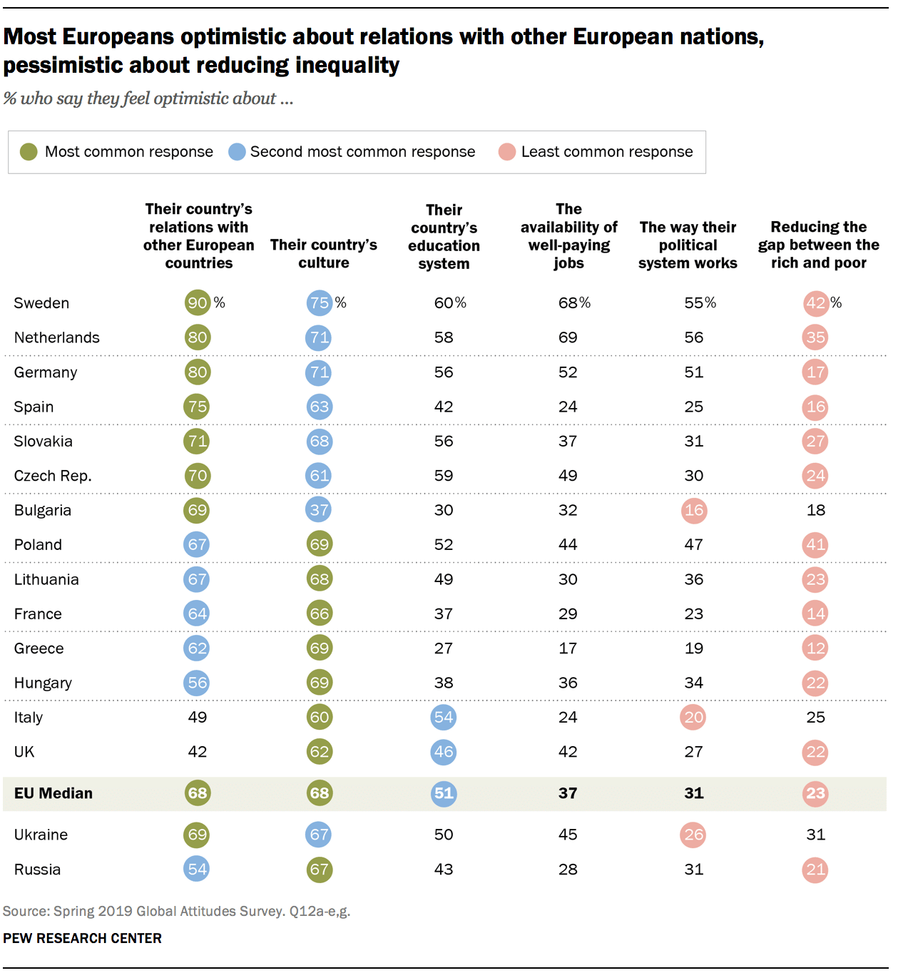Le constat est plus mitigé sur l’emploi : seuls 37 % expriment de l’optimisme pour la disponibilité d’emplois bien rémunérés. Les écarts entre pays sont réels : en Grèce, où le chômage atteignait 19,3 % en 2018, le taux le plus élevé de l’UE,, seuls 17 % jugent les perspectives d’emploi favorables. L’Espagne et l’Italie partagent ce pessimisme, avec des taux de chômage respectifs de 15,4 % et 10,8 %. Plus le chômage est élevé, plus le pessimisme sur l’emploi domine dans les pays membres.