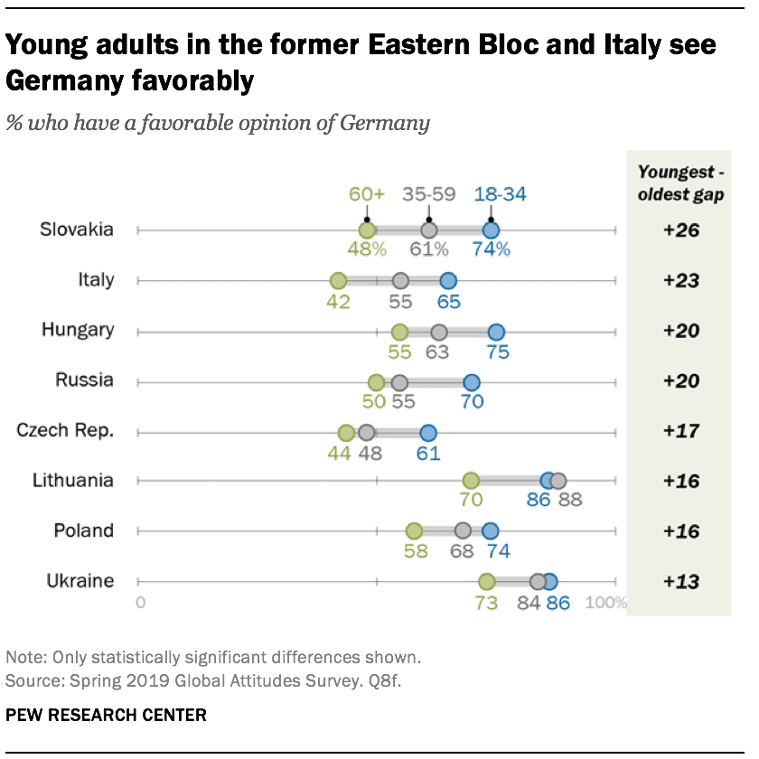 En Europe occidentale, l’Italie présente également ce fossé : 65 % des jeunes ont une opinion positive de l’Allemagne, contre 42 % chez les plus âgés.
