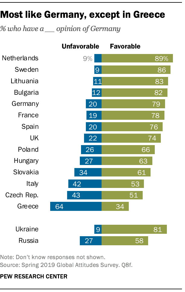 La Grèce fait figure d’exception. Près de 64 % des Grecs ont une opinion négative de l’Allemagne, pour seulement 34 % de favorables. Ce ressentiment ne date pas d’hier : en 2012, la Grèce désignait déjà l’Allemagne comme le pays le moins digne de confiance de l’UE, le plus arrogant et le moins empathique. Pourtant, les avis positifs progressent : en pleine crise de la dette, seuls 21 % des Grecs voyaient l’Allemagne d’un bon œil.