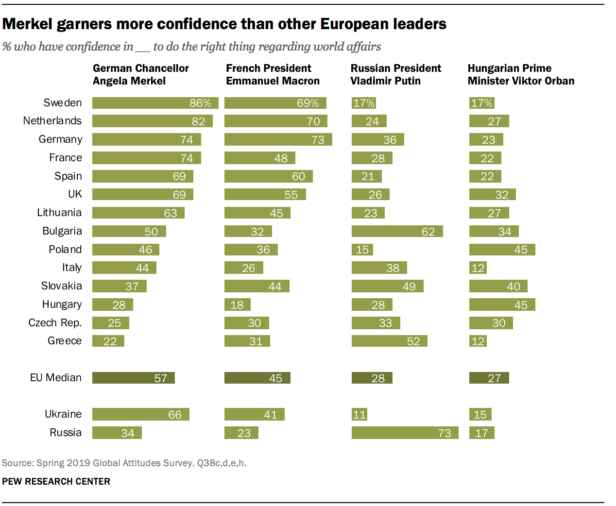 Vladimir Poutine recueille la confiance de 28 % en médiane parmi les 14 pays de l’UE. Sans surprise, il obtient ses meilleurs résultats en Russie, où près de trois quarts de la population lui font confiance, mais il est aussi bien vu par une majorité de Bulgares, Grecs et Slovaques. En Lituanie, Suède, Espagne, Pologne, Pays-Bas, un quart ou moins lui accordent leur confiance, et en Ukraine, seulement 11 % se disent confiants en Poutine.