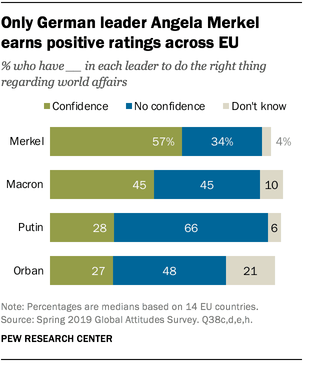 Parmi les principaux dirigeants européens évalués dans cette enquête, Angela Merkel surclasse ses pairs en matière de confiance publique. Dans plus de la moitié des 14 pays de l’UE interrogés, une majorité accorde sa confiance à la chancelière allemande, qui avait annoncé son retrait après les élections fédérales de 2021. Le soutien le plus marqué provient de la Suède, des Pays-Bas, de la France, qui la plébiscitent parfois plus que ses propres compatriotes. En Allemagne, près des trois quarts des sondés lui font confiance, que ce soit à l’Ouest (75 %) ou à l’Est (68 %), là où elle a grandi. On retrouve des majorités similaires en Espagne, au Royaume-Uni, en Ukraine et en Lituanie.