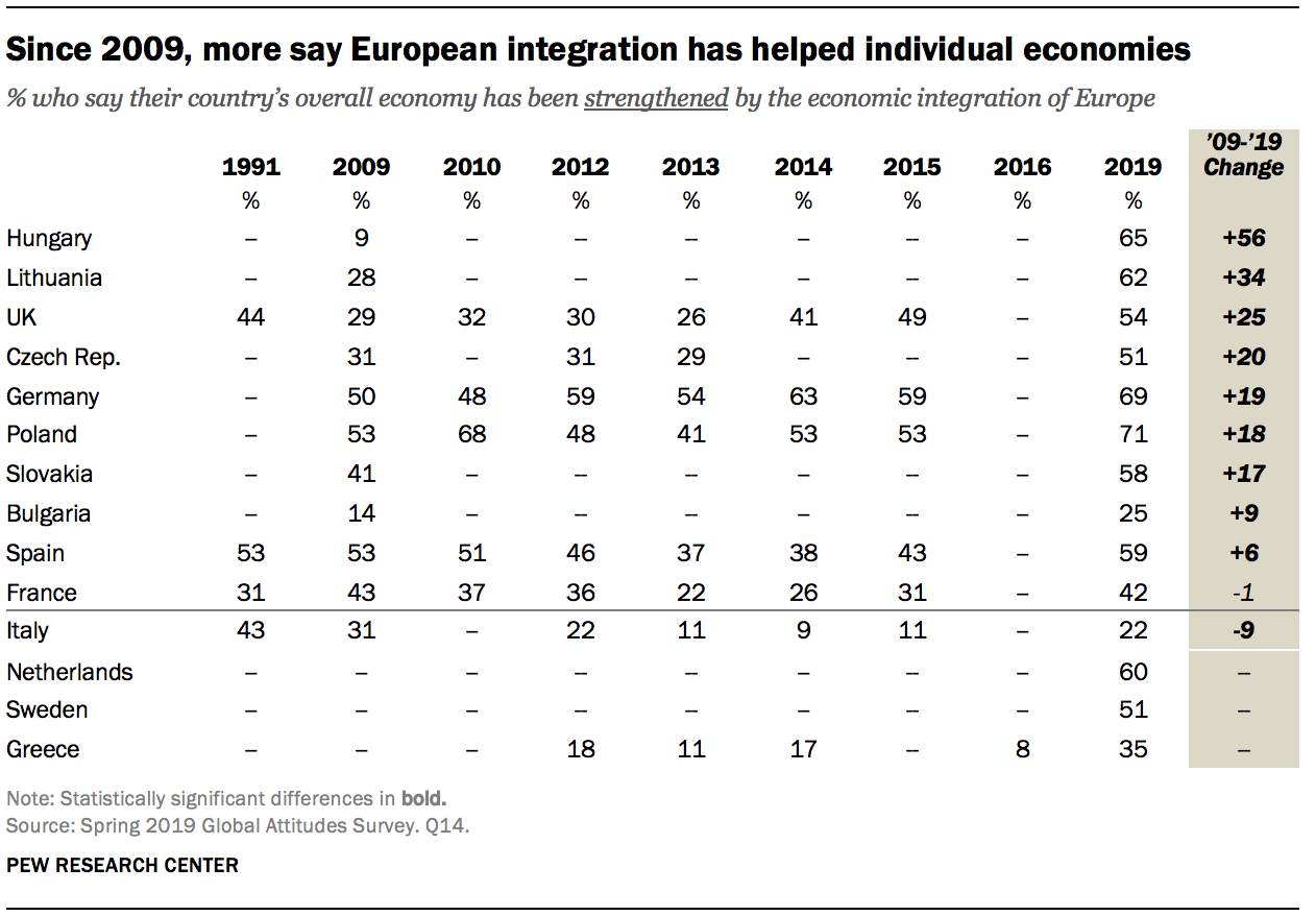Pour illustrer cette évolution : en 2009, à peine 9 % des Hongrois estimaient que l’UE avait aidé leur économie. En 2019, le chiffre bondit à 65 %. On observe des hausses similaires à deux chiffres en Lituanie, au Royaume-Uni, en République tchèque, en Allemagne, en Pologne ou en Slovaquie.
